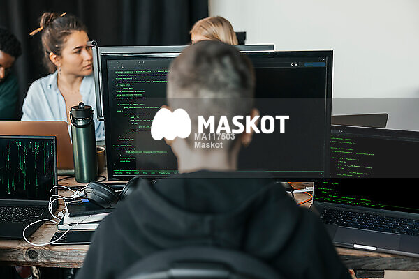 Programmerare jobbar vid dator på nystartat kontor