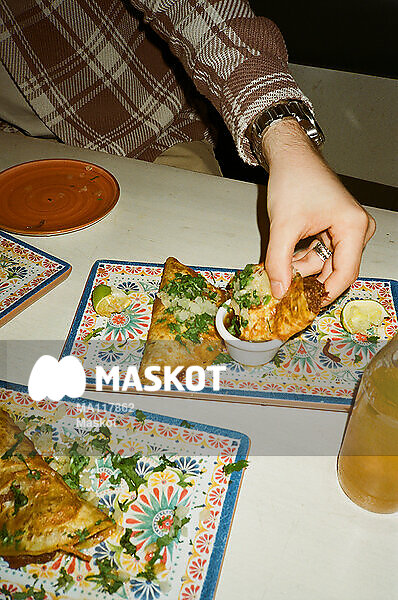 Man doppar tacos i sås på restaurang