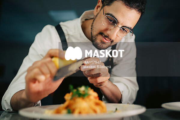 Manlig professionell kock river citron på maträtt