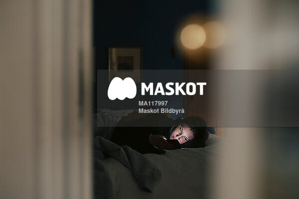 Ung kvinna använder mobil i säng