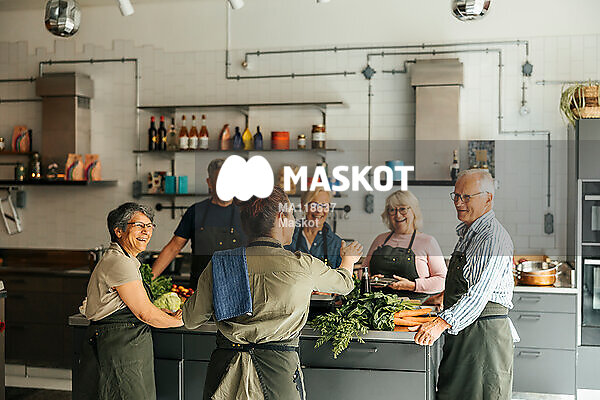 Äldre män och kvinnor lyssnar på kock under matlagningskurs