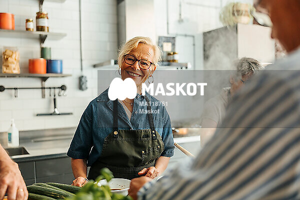 Porträtt av leende äldre kvinna som står i kök under matlagningskurs