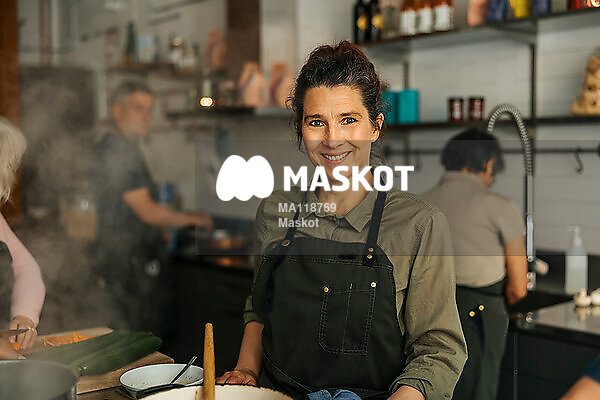 Porträtt av leende kvinnlig kock som står vid gryta under matlagningskurs
