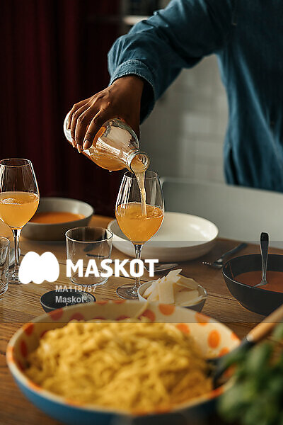 Äldre kvinna häller upp apelsinjuice i glas vid matbord