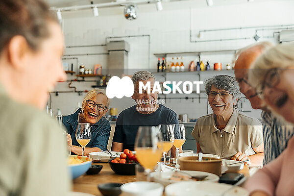 Glada äldre manliga och kvinnliga deltagare njuter av lunch med kock efter matlagningskurs