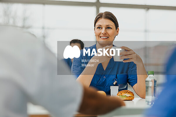 Leende sjuksköterska håller mugg under frukost i sjukhuscafeteria