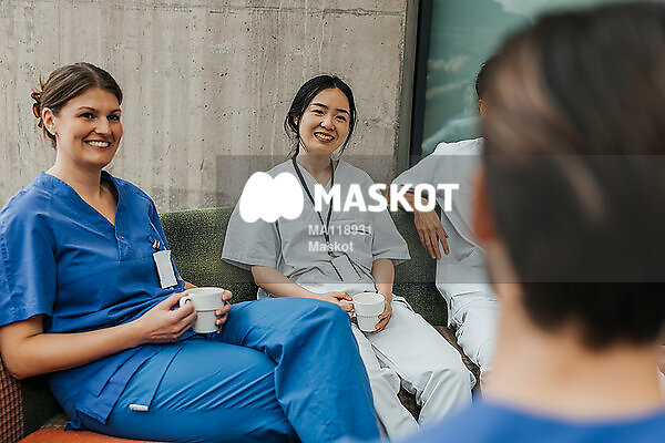 Leende kvinnliga läkare sitter i soffa med kaffemuggar