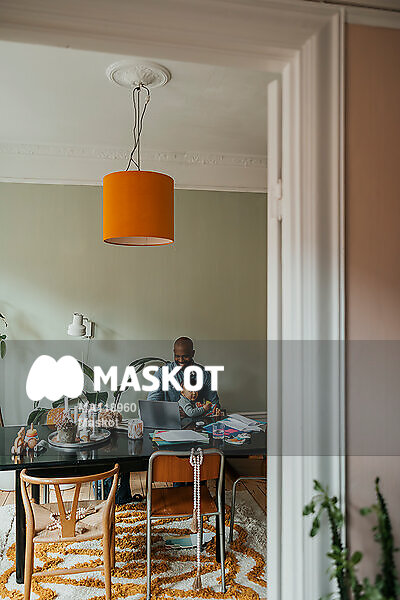 Man med barn i famn arbetar på dator vid matbord