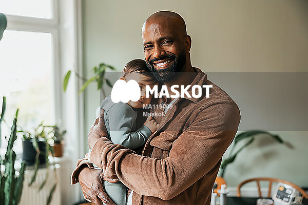 Porträtt av glad far som bär barn i lägenhet