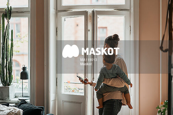 Mamma bär bebis och håller i mobil vid fönster i lägenhet