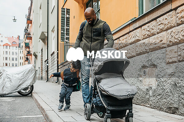 Glad pappa går med son och barnvagn på trottoar utanför lägenhetshus