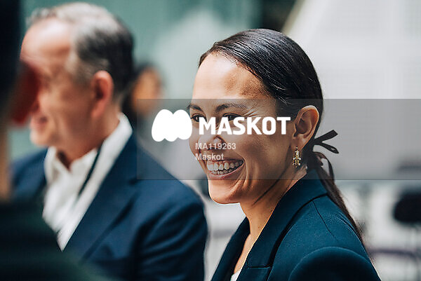 Glad affärskvinna står med kollegor på konferens