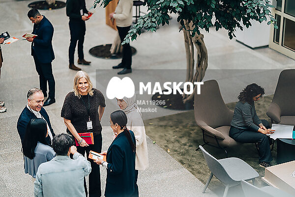Manliga och kvinnliga entreprenörer pratar under konferens