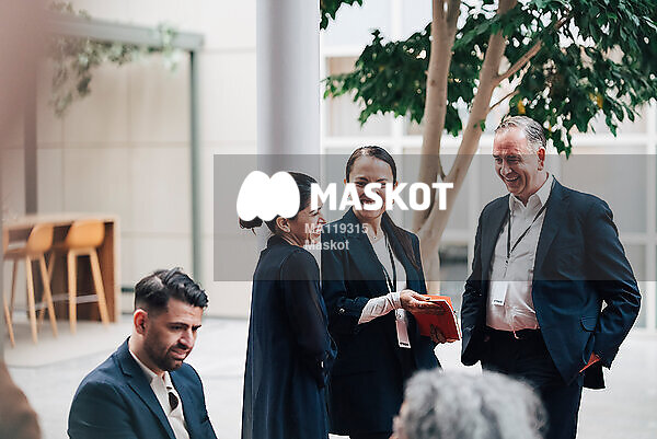 Glad affärskvinna står med kollegor på konferens