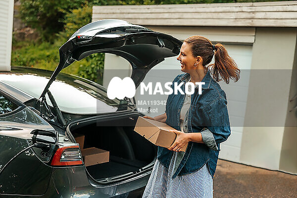 Glad kvinna packar ur kartong ur bil