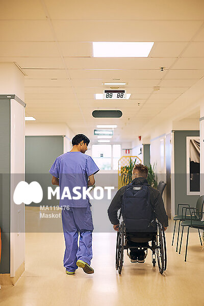 Manlig läkare går bredvid rullstolsburen man i sjukhuskorridor