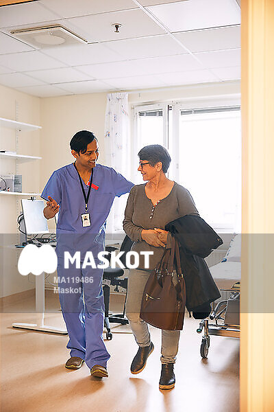 Manlig läkare leder äldre kvinnlig patient ut