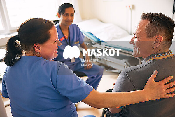 Manlig och kvinnlig läkare sitter med rullstolsburen patient i undersökningsrum
