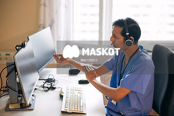 Manlig läkare förklarar symtom för patient via videosamtal på dator