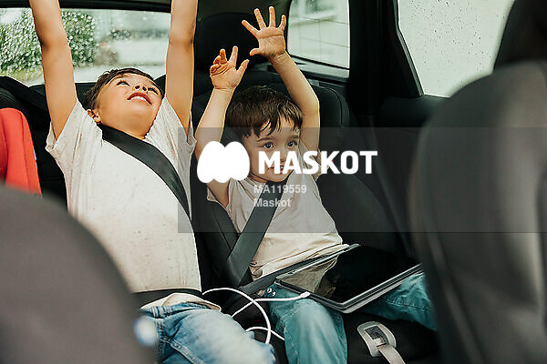 Unga glada pojkar sitter i baksäte i bil med surfplatta