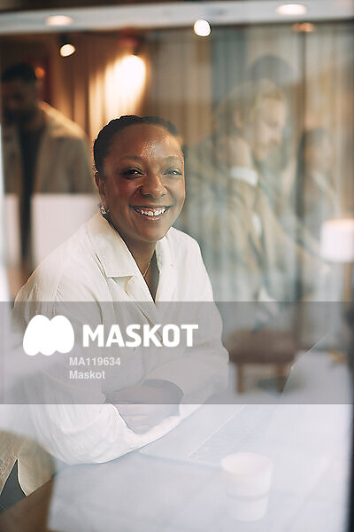 Porträtt av glad affärskvinna som sitter på kontor