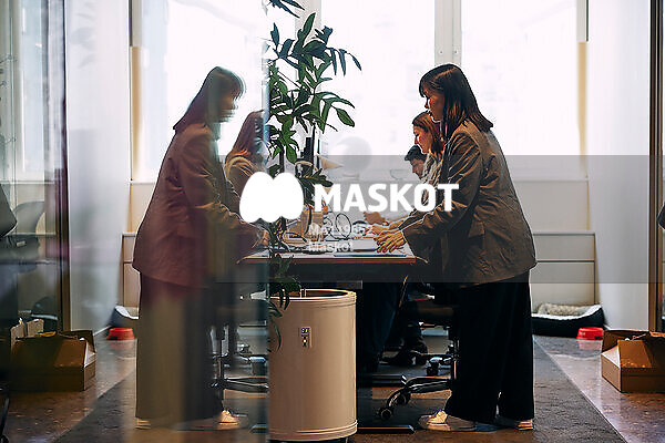 Affärskvinna står vid skrivbord på kontor