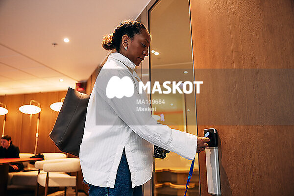 Affärskvinna använder kodbricka för att låsa upp dörr i kontor