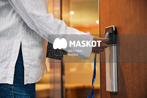 Affärskvinna använder kodbricka för att låsa upp dörr i kontor