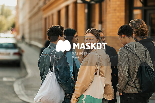 Porträtt av leende ung kvinna som står med vänner utomhus