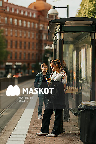 Ung kvinna står vid station med mobil