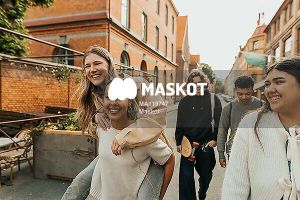 Leende ung kvinna bär kompis på rygg i stad