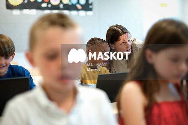 Kvinnlig förskolelärare hjälper ung pojke i klassrum