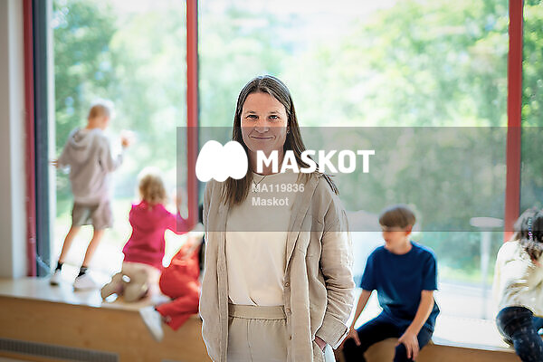 Porträtt av leende kvinnlig förskolelärare som står i klassrum