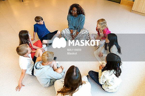 Kvinnlig förskolelärare sitter i ring med elever