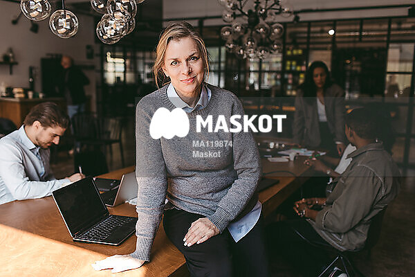Porträtt av leende affärskvinna som sitter på bord i kontor