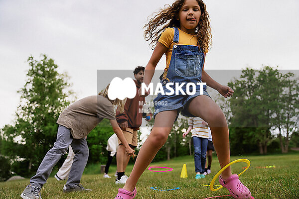 Ung flickar leker utomhus under sommarläger