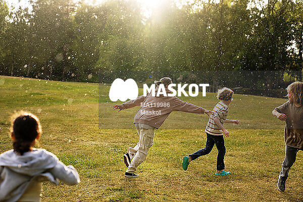 Kvinnlig lägerledare jagar barn på gräsplätt i regn