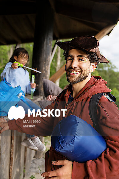 Porträtt av leende manlig lägerledare sittande med barn under regnskydd