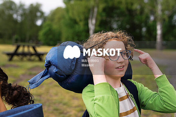 Ung pojke med glasögon bär sovsäck på sommarläger