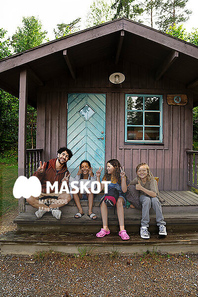Porträtt av lägerledare och barn som gestikulerar vid stuga