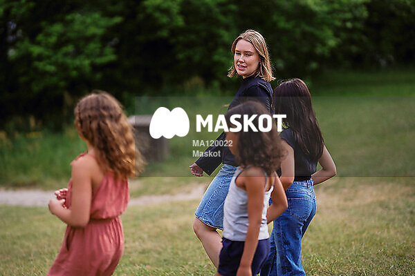Kvinnlig lägerledare går med unga flickor