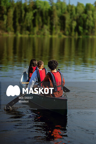 Lägerledare sitter med barn i kanot
