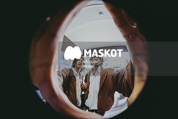 Porträtt av leende unga manliga vänner