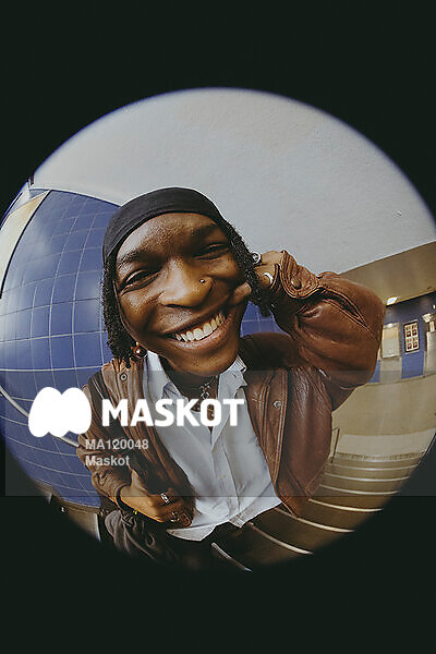 Porträtt av glad ung man med näspiercing