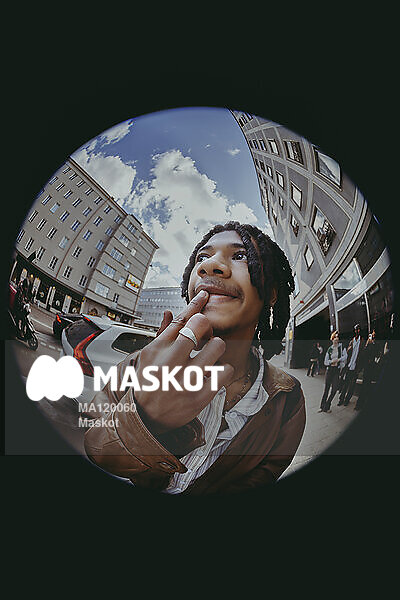 Ung man kollar bort stående på gata