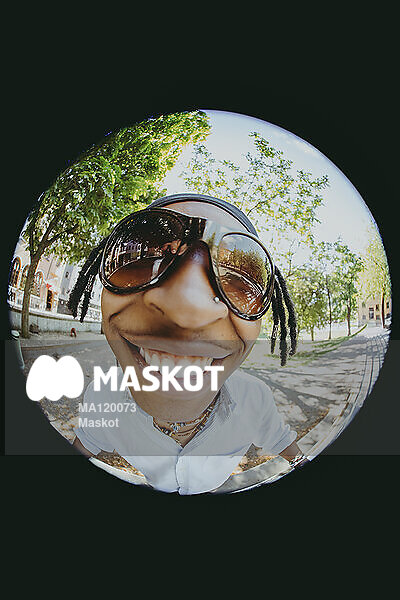 Porträtt av glad ung man med solglasögon