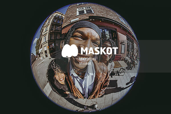 Porträtt av glad ung man med vänner