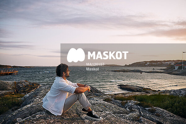 Man sitter på klippa vid vatten