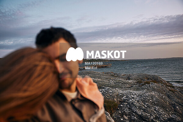 Man och kvinna sitter på klippa vid vatten