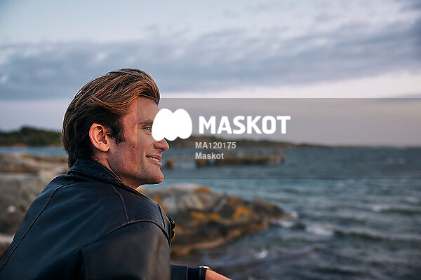 Leende man sitter på klippa vid vatten
